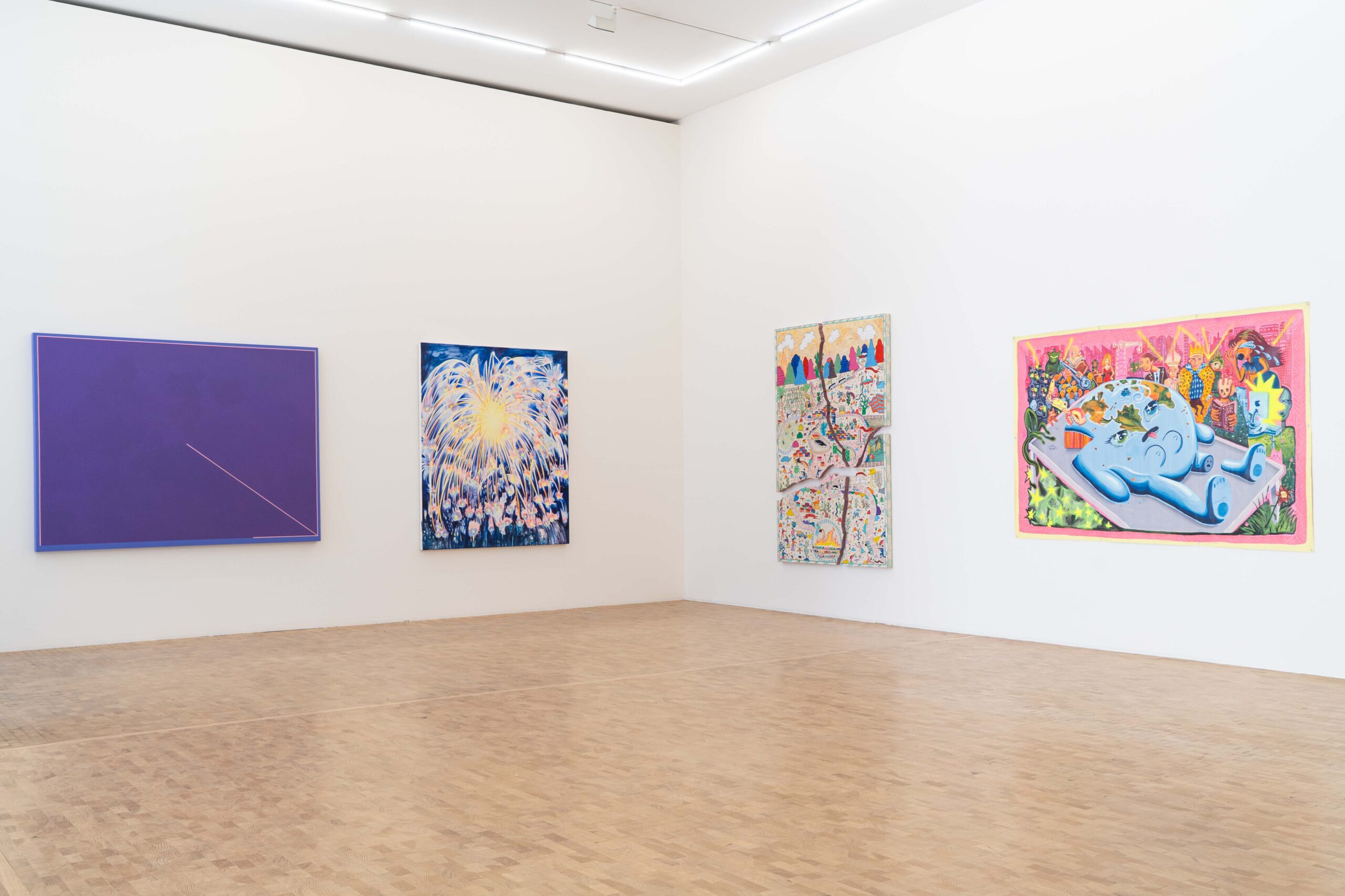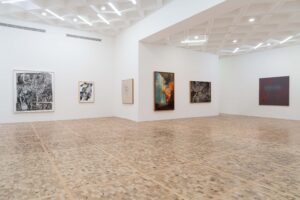 A partir de esa imagen, se propone un diálogo entre épocas y sensibilidades. Obras de Joy Laville, Rufino Tamayo, José Clemente Orozco y Ricardo Martínez —joyas poco vistas del acervo de la galería— conviven con creadores contemporáneos como Stefan Brüggemann y Abel Quezada Rueda, además de artistas invitados como Pedro Reyes, Miguel Calderón, Tania Pérez Córdova o Dexter Dalwood. Conviven diferentes formatos como pintura, grabado, escultura e incluso instalación, como en el caso del artista francés Antoine Catala y su espectacular letra inflable que hace una original alegoría al espíritu que domina esa muestra.
