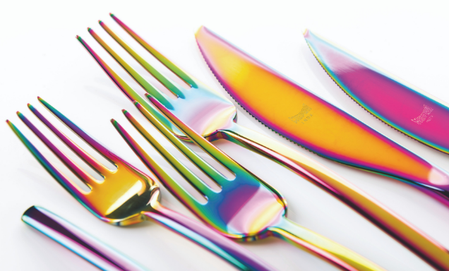 Todos los cubiertos de la colección están elaborados con una base de titanio, lo que los hace prácticamente eternos (¡jamás se oxidarán!), pero en el caso de Rainbow, además se les dio un acabado para lograr ese efecto tornasolado con el que logran captar todos los colores del arcoíris… Si a esto sumamos su dise�...