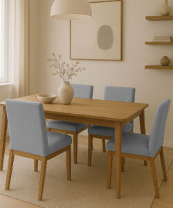 El primer criterio siempre es la mesa. La altura estándar del asiento ronda los 45 cm, una medida que asegura comodidad y proporción, independientemente del diseño. La forma también influye: mesas rectangulares admiten mayor variedad de estilos, mientras que las redondas se benefician de sillas visualmente ligeras que favorezcan la circulación y el equilibrio del conjunto.
