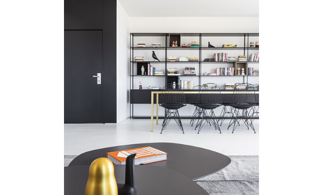 Por cierto, entre el mobiliario elegido, destacan piezas de MDF Italia, como el librero “Minima 3.0” de Bruno Fattorini, que se colocó en el comedor dándole así una nueva e inesperada función. También, y siguiendo con la idea de un mobiliario de diseño limpio, se recurrió a la mesa “Tense Material Brass” diseñado por los Cazzaniga.