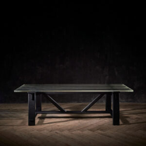 La mesa Invictus, con su roble centenario y tapa de mármol cincelada, transmite solidez y permanencia, mientras que la A-Frame reinterpreta el caballete clásico con un toque arquitectónico y líneas firmes que dan presencia a cualquier comedor.