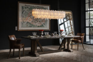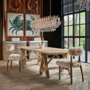 La Iceberg sorprende con tres placas de vidrio texturizado flotando sobre un marco de acero, evocando bloques de hielo suspendidos, y la mesa Axel combina madera rescatada de antiguos barcos chinos con metal, revelando la fuerza del tiempo y el carácter único de cada pieza.