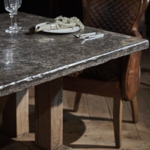 Entre sus diseños, la mesa de comedor Monastery se inspira en las antiguas mesas de monasterio: una base de roble recuperado de más de un siglo y cubiertas de mármol —negro, blanco o Bluemoon— con bordes cincelados a mano que aportan carácter y sofisticación. Sus variantes, Bluemoon con Side Saddle ySelenite Rect, amplían las posibilidades de combinación.