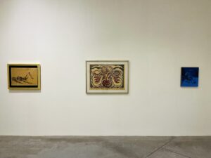 A partir de esa imagen, se propone un diálogo entre épocas y sensibilidades. Obras de Joy Laville, Rufino Tamayo, José Clemente Orozco y Ricardo Martínez —joyas poco vistas del acervo de la galería— conviven con creadores contemporáneos como Stefan Brüggemann y Abel Quezada Rueda, además de artistas invitados como Pedro Reyes, Miguel Calderón, Tania Pérez Córdova o Dexter Dalwood. Conviven diferentes formatos como pintura, grabado, escultura e incluso instalación, como en el caso del artista francés Antoine Catala y su espectacular letra inflable que hace una original alegoría al espíritu que domina esa muestra.